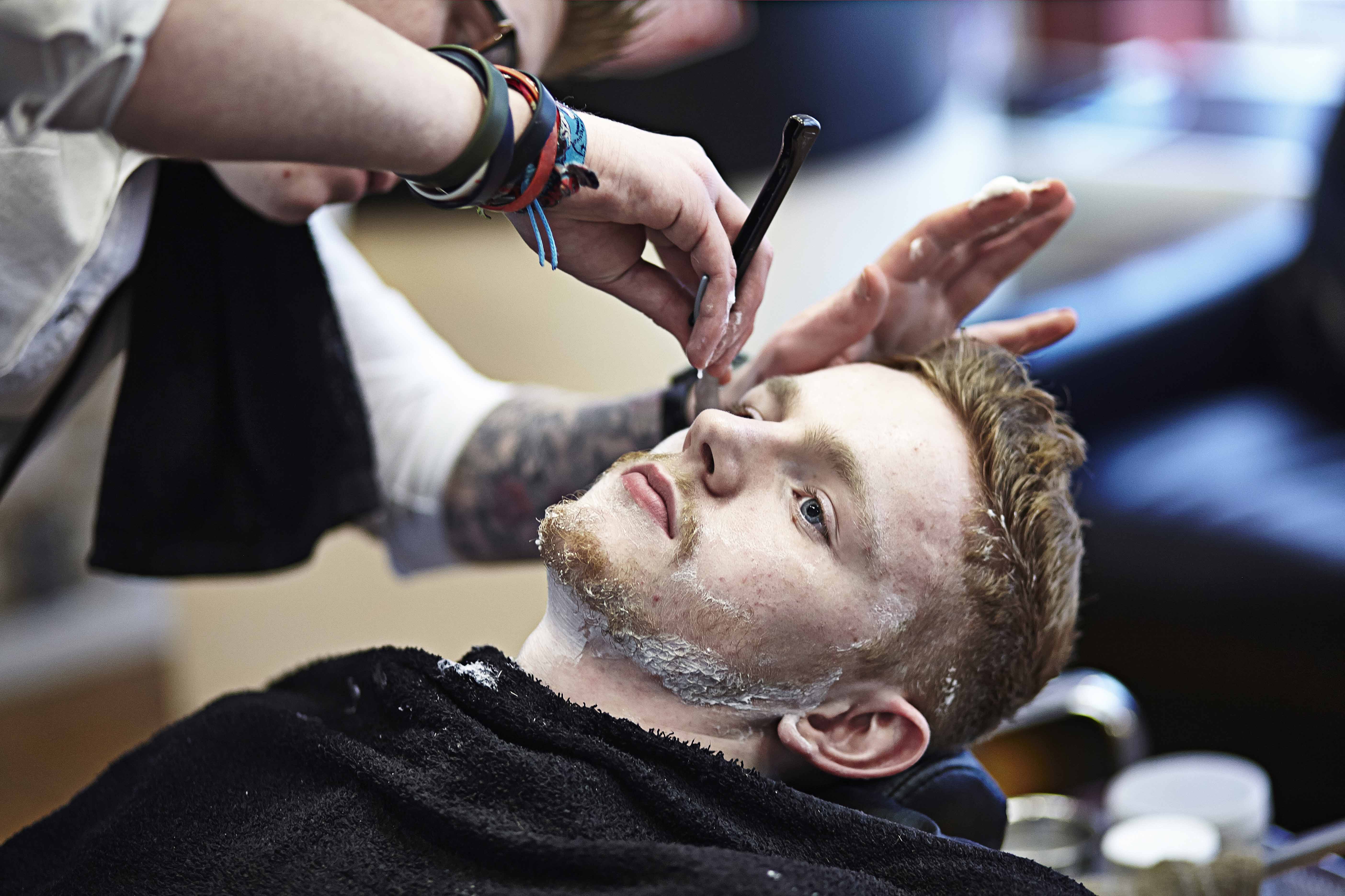Drakes, Barbers Shop, Gorleston, Great Yarmouth, Young male, red head, shirt and braces, white, hairdressing, glasses. Jamie Garbutt, Jamie Garbutt Photography, editorial photography, commercial photography.