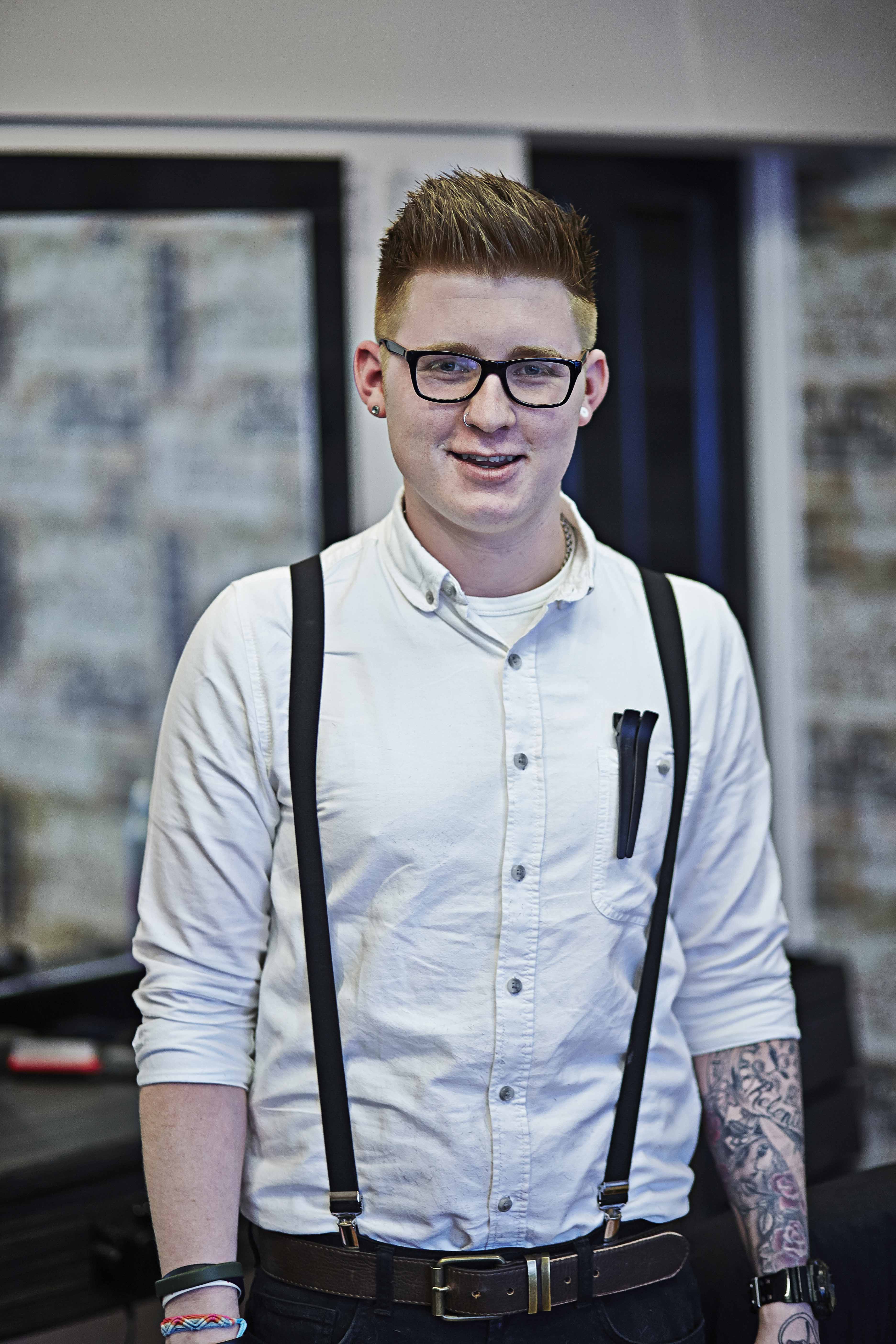 Drakes, Barbers Shop, Gorleston, Great Yarmouth, Young male, red head, shirt and braces, white, hairdressing, glasses. Jamie Garbutt, Jamie Garbutt Photography, editorial photography, commercial photography.