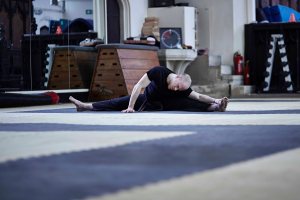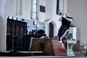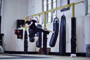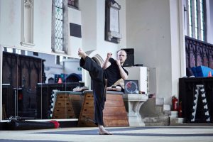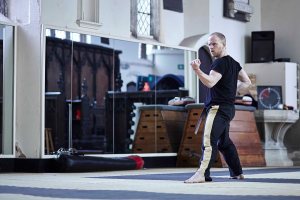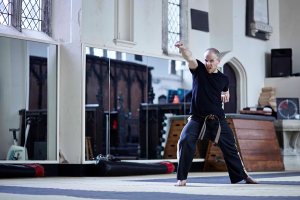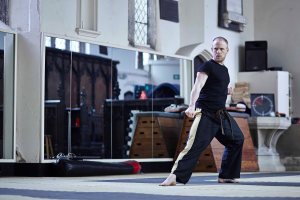 A series of images showing a lone male practising Tae-Kwon-Do Kata in a studio.